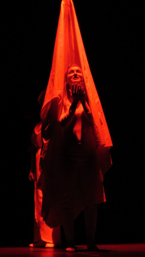 (Se abre telón, suena música, La tela está suspendida sobre ellas dos. Se ilumina la tela y poco a poco se ilumina la escena. En el centro del escenario yace la hija, parte de su cuerpo descansa en los brazos de su madre que la sostiene, inerte, sin vida)